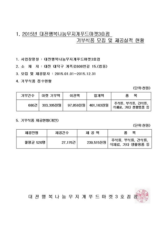 19-03-28 11:27 대전행복나눔무지개푸드마켓3호점 2015년 기부식품 모집 및 제공실적 현황 페이지 정보 작성자 성우보육원 댓글 0건 조회 5,619회 본문 2015년 기부식품 모집 및 제공실적 현황 목록 댓글목록 댓글목록 등록된 댓글이 없습니다.