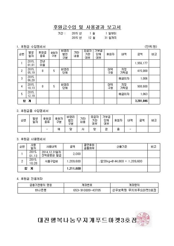19-03-28 11:27 대전행복나눔무지개푸드마켓3호점 2015년 후원금 수입 및 사용결과 페이지 정보 작성자 성우보육원 댓글 0건 조회 5,495회 본문 2015년 후원금 수입 및 사용결과 공고 목록 댓글목록 댓글목록 등록된 댓글이 없습니다.