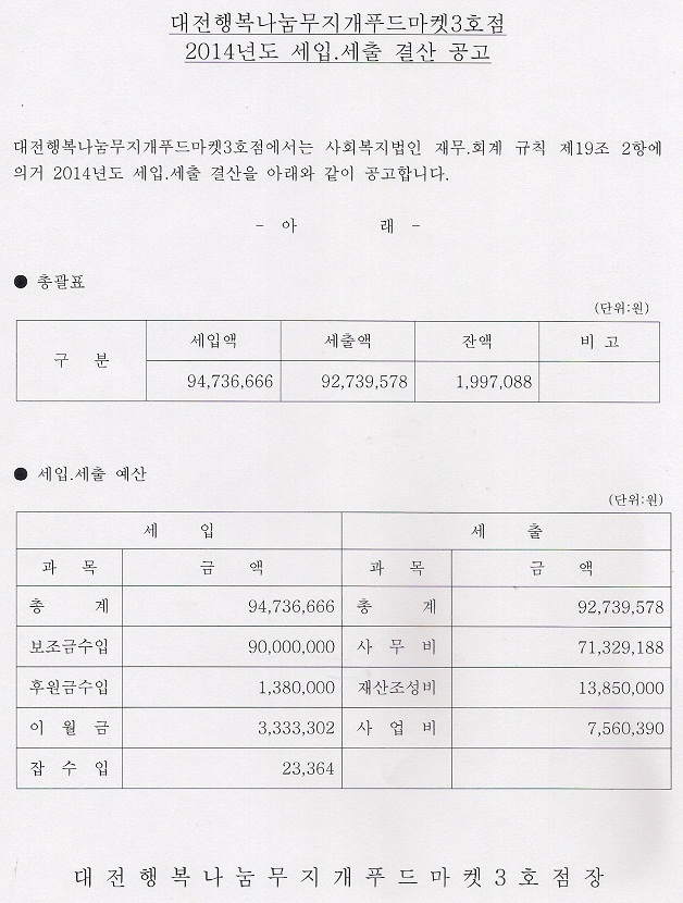 19-03-28 11:19 대전행복나눔무지개푸드마켓3호점 2014년도 세입.세출 결산공고 페이지 정보 작성자 성우보육원 댓글 0건 조회 5,271회 본문 대전행복나눔무지개푸드마켓3호점 2014년도 세입.세출 결산공고 목록 댓글목록 댓글목록 등록된 댓글이 없습니다.
