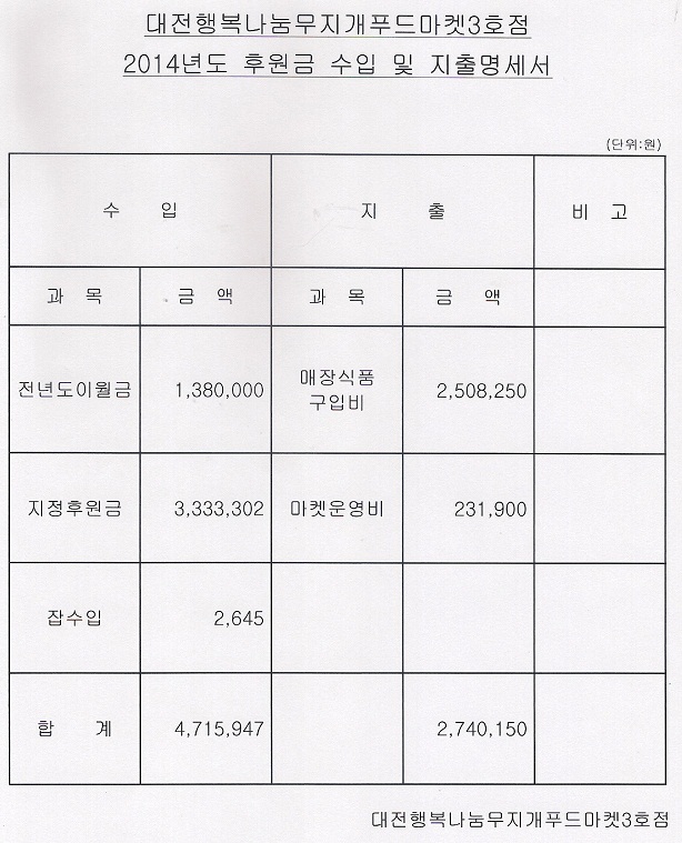 19-03-28 11:20 대전행복나눔무지개푸드마켓3호점 2014년도 후원금 수입 및 지출명세 공고 페이지 정보 작성자 성우보육원 댓글 0건 조회 5,816회 본문 대전행복나눔무지개푸드마켓3호점 2014년도 후원금 수입 및 지출명세 공고 목록 댓글목록 댓글목록 등록된 댓글이 없습니다.