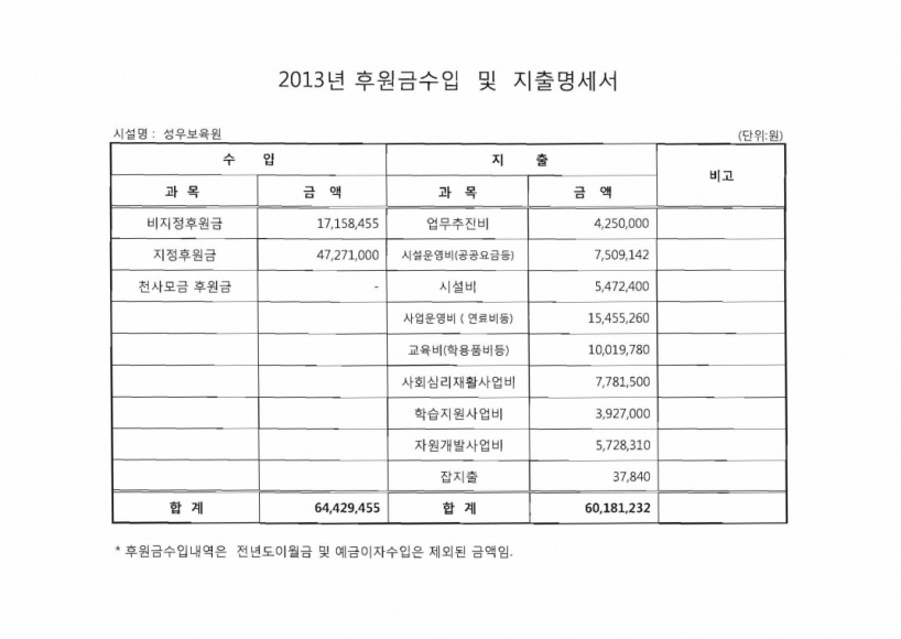 19-03-28 10:59 <공고>2013년 후원금 수입 및 지출명세서 페이지 정보 작성자 성우보육원 댓글 0건 조회 6,071회 본문 2013년 후원금 수입 및 지출명세서 목록 댓글목록 댓글목록 등록된 댓글이 없습니다.