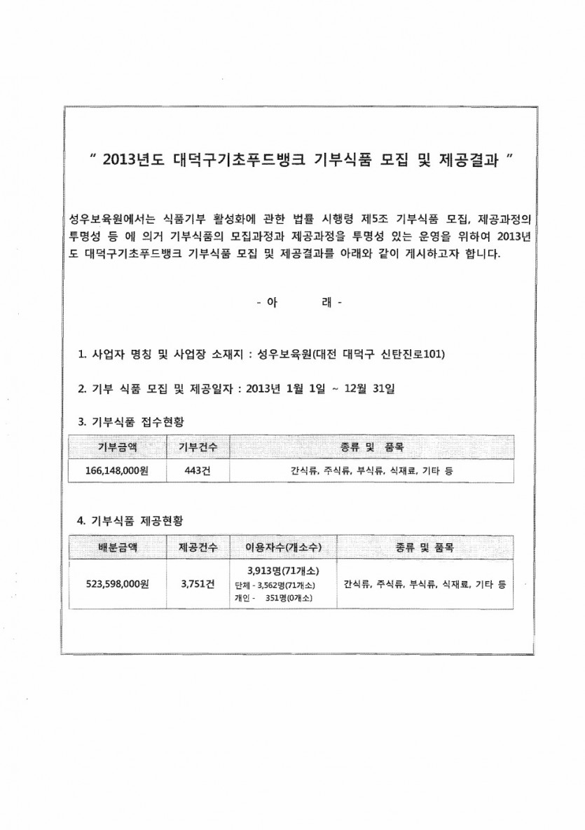 19-03-28 11:00 2013년 대덕구기초푸드뱅크 운영실적(기부식품 모집 및 제공결과) 페이지 정보 작성자 성우보육원 댓글 0건 조회 5,496회 본문 2013년도 대덕구기초푸드뱅크 운영실적(기부식품 모집 및 제공결과)을 게시합니다. 목록 댓글목록 댓글목록 등록된 댓글이 없습니다.