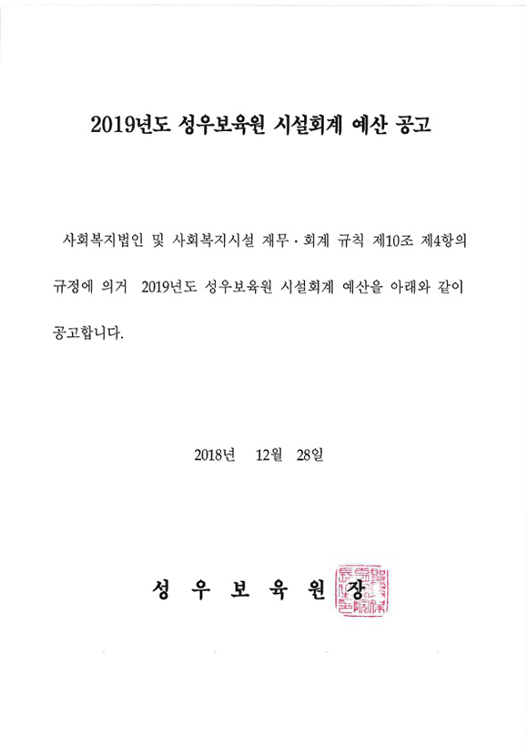 18-12-28 11:48 (공고) 2019년도 성우보육원 시설회계 예산 페이지 정보 작성자 성우보육원 댓글 0건 조회 5,793회 본문 2019년도 성우보육원 시설회계 예산 공고입니다. 목록 댓글목록 댓글목록 등록된 댓글이 없습니다.