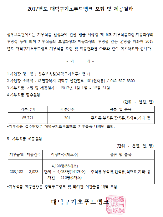 19-03-28 11:43 2017년도 대덕구기초푸드뱅크 모집 및 제공결과 페이지 정보 작성자 성우보육원 댓글 0건 조회 5,503회 본문 2017년도 대덕구기초푸드뱅크 모집 및 제공결과 목록 댓글목록 댓글목록 등록된 댓글이 없습니다.