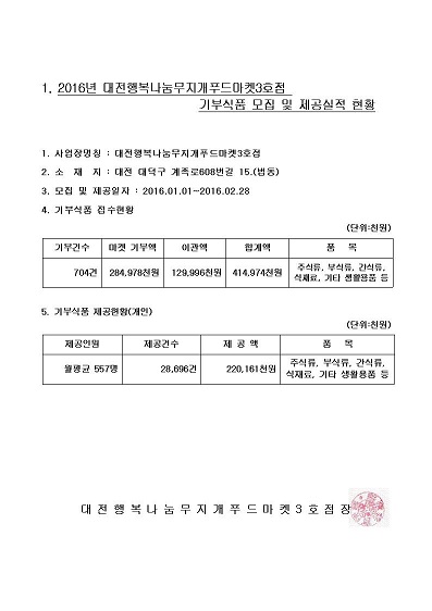 19-03-28 11:36 2016년 대전행복나눔무지개푸드마켓3호점 기부식품 모집 및 제공실적 현황 페이지 정보 작성자 성우보육원 댓글 0건 조회 5,432회 본문 2016년 대전행복나눔무지개푸드마켓3호점 기부식품 모집 및 제공실적 현황 목록 댓글목록 댓글목록 등록된 댓글이 없습니다.