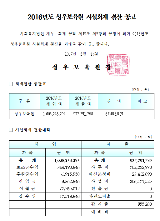 19-03-28 11:37 (공고)2016년 시설회계 결산 페이지 정보 작성자 성우보육원 댓글 0건 조회 5,898회 본문 2016년 시설회계 결산 목록 댓글목록 댓글목록 등록된 댓글이 없습니다.