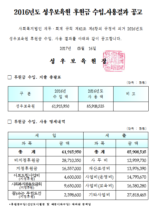 19-03-28 11:37 (공고) 2016년 후원금 수입 및 지출명세서 페이지 정보 작성자 성우보육원 댓글 0건 조회 5,630회 본문 2016년 후원금 수입 및 지출명세서 목록 댓글목록 댓글목록 등록된 댓글이 없습니다.