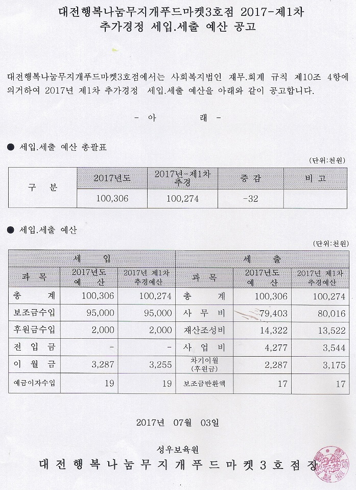 19-03-28 11:39 대전행복나눔무지개푸드마켓3호점 2017-1차 추가경정 세입.세출 예산서 페이지 정보 작성자 성우보육원 댓글 0건 조회 5,627회 본문 대전행복나눔무지개푸드마켓3호점 2017-1차 추가경정 세입.세출 예산서 목록 댓글목록 댓글목록 등록된 댓글이 없습니다.