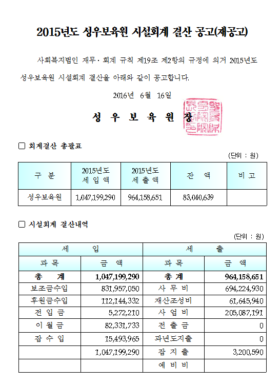 19-03-28 11:31 (재공고)2015년 시설회계 결산 페이지 정보 작성자 성우보육원 댓글 0건 조회 5,699회 본문 (재공고)2015년 시설회계 결산 목록 댓글목록 댓글목록 등록된 댓글이 없습니다.