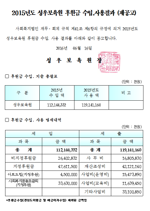 19-03-28 11:31 (재공고) 2015년 후원금 수입 및 지출명세서 페이지 정보 작성자 성우보육원 댓글 0건 조회 5,860회 본문 2015년 후원금 수입 및 지출명세서 목록 댓글목록 댓글목록 등록된 댓글이 없습니다.