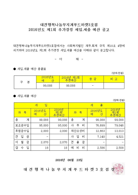 19-03-28 11:32 행복나눔무지개푸드마켓3호점 2016년도 제1회 추가경정 세입.세출 예산공고 페이지 정보 작성자 성우보육원 댓글 0건 조회 6,155회 본문 행복나눔무지개푸드마켓3호점 2016년도 제1회 추가경정 세입.세출 예산공고 목록 댓글목록 댓글목록 등록된 댓글이 없습니다.