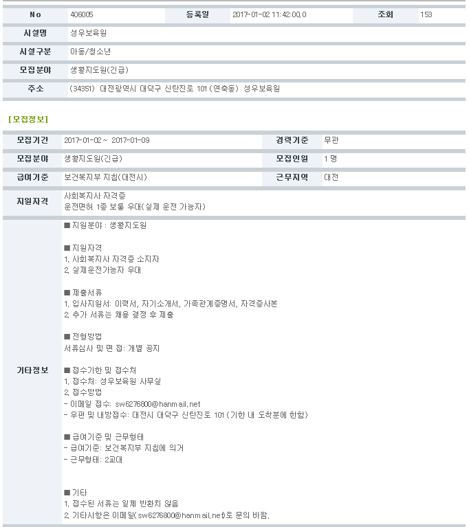 19-03-28 11:34 (공고) 생활지도원 모집 공고(긴급) 페이지 정보 작성자 성우보육원 댓글 0건 조회 5,776회 본문 (공고) 생활지도원 모집 공고(긴급) 목록 댓글목록 댓글목록 등록된 댓글이 없습니다.