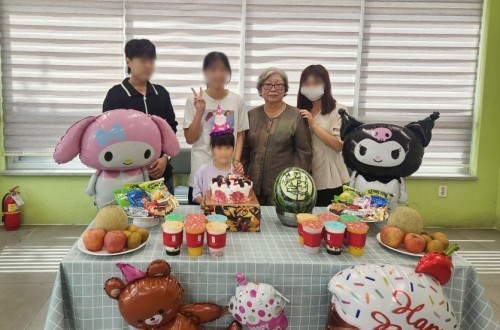 생일을 맞이한 아동에게 모든 아동들이 생일 축하 인사를 전해주며 맛있는 케이…