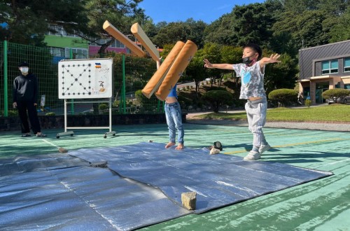 추석을 맞이하여 원내 아동들이 운동장에 모두 모여 민속놀이(투호, 아기 사방) 활동을 진…