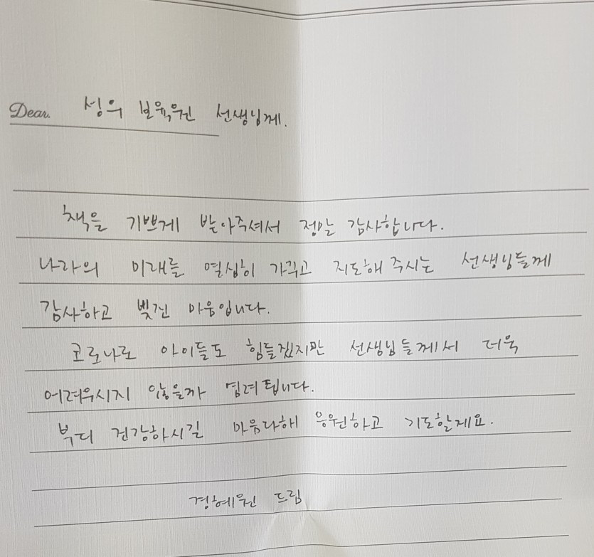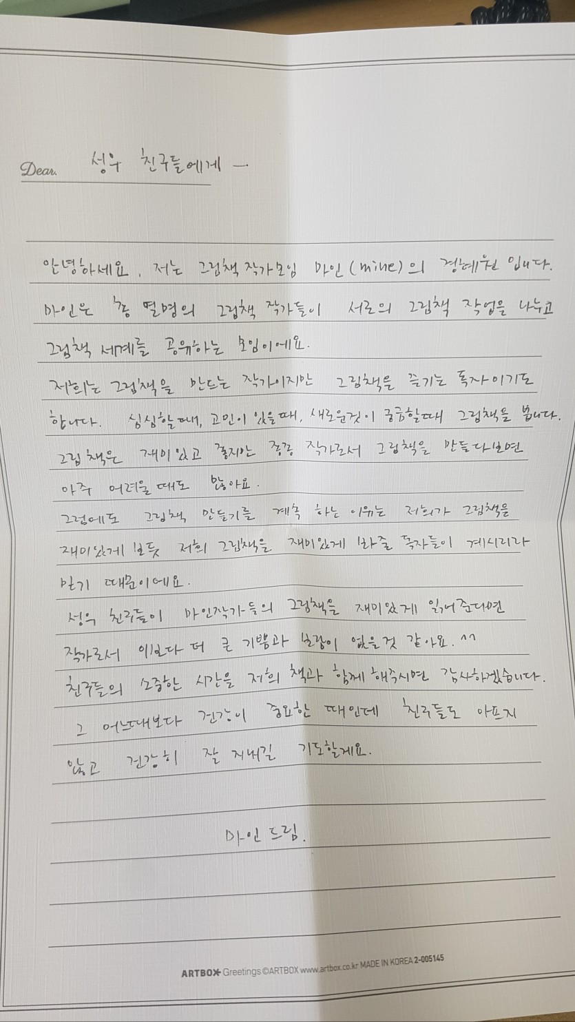 20200527 마인(mine-그림책작가모임)의 마음 따뜻한 책 선물 페이지 정보 작성자 성우보육원 댓글 0건 조회 5,467회 본문 마인(mine)이라는 그림책작가모임에서 성우아이들을 위해 마음 따뜻한 손편지와 함께 책 선물을 후원해주셨습니다.우리 아이들을 '나라의 미래'라고 표현해주시는, 작가님들의 응원을 통해 오늘도 성우아이들은 사랑을 한가득 받게 되었습니다.^^성우아이들이 즐거운 상상의 나래를 맘껏 펼칠 수 있도록 도움을 주신 마인 작가님들께 감사의 인사를 드립니다. 목록 댓글목록 댓글목록 등록된 댓글이 없습니다.