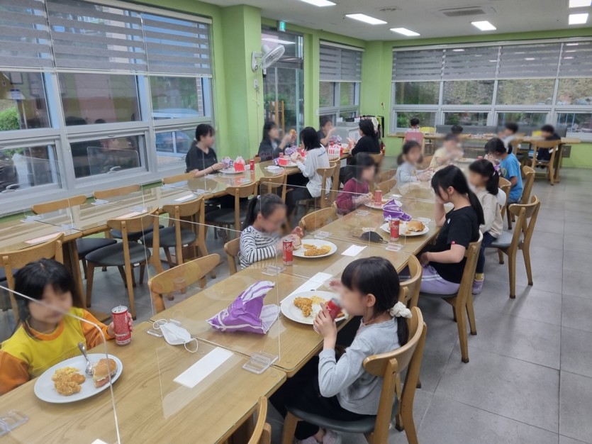 아이들 모두 음식을 먹으며 행복해 하였으며, 남김없이 맛있게 먹었습니다.